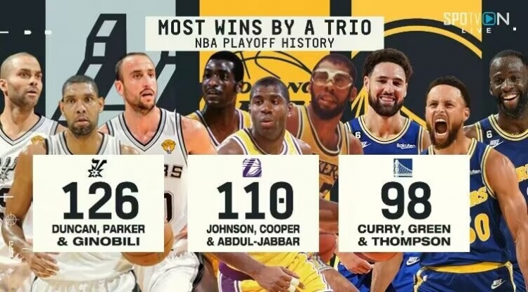 According to statistics, Curry, clay, and dream three have won 98 games in the playoffs so far, ranking third in NBA history, second only to Spurs GDP three (126 games) and magicians, Jabal, michael Cooper trio (110 games).
