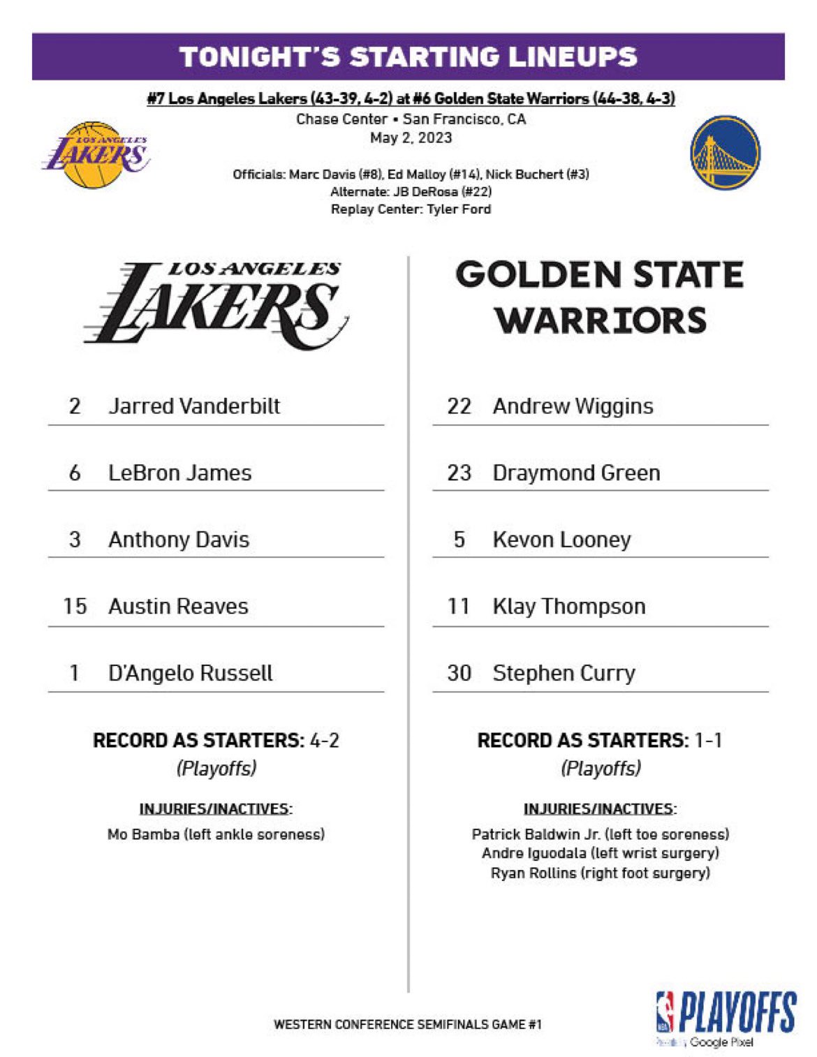 Lakers starting: Vanderbilt, James, heavy eyebrows, Reeves, Russell.