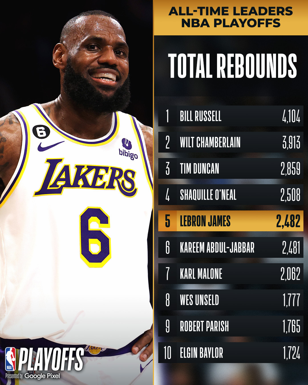 Top four of the playoff history rebound list: Bill Russell (4104), Wilt Chamberlain (3913), Duncan (2859) and Shaq O’Neal (2508).