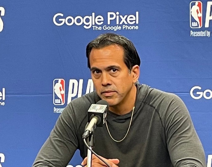Before the game, Heat coach spoolstra was interviewed by reporters.