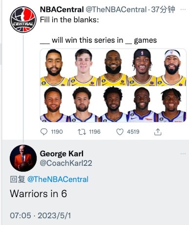 After the game, former NBA coach George Carl gave his own prediction for this round of series. He replied to the question of American media NBA Central and wrote: “Warriors advanced in 6 games.”