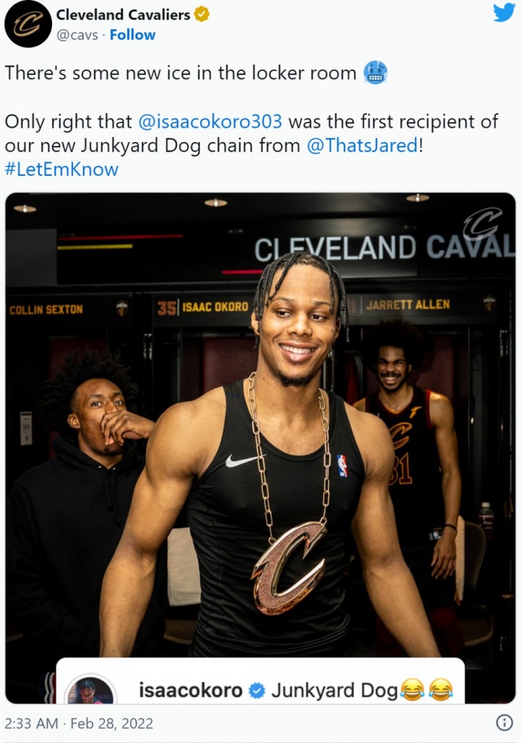 After the knight defeated the Wizards in last February, Okolo became the first winner of the chain. Stevens first got this chain on March 8 last year, after the Knight beat the Pacers away. Since then, this chain has been passed down in the Cavaliers. Stevens said: “I think this is really cool. This idea is very good and creative. In another way, let’s focus on winning and playing every round. Because the outside world always pays more attention to top scorer or something like that, but this award is a little different. As long as you help a lot in winning, you will stand in the spotlight. Even if your score is not high, help the team win by doing some small things well. For a successful team, it is equally important to have players who can do all kinds of things well. Therefore, this is what we really embrace and take pride in. Everyone’s purpose in playing is to get the necklace. In fact, this is equivalent to instilling a mentality into the players, and people who play in the right way can get rewards.”
