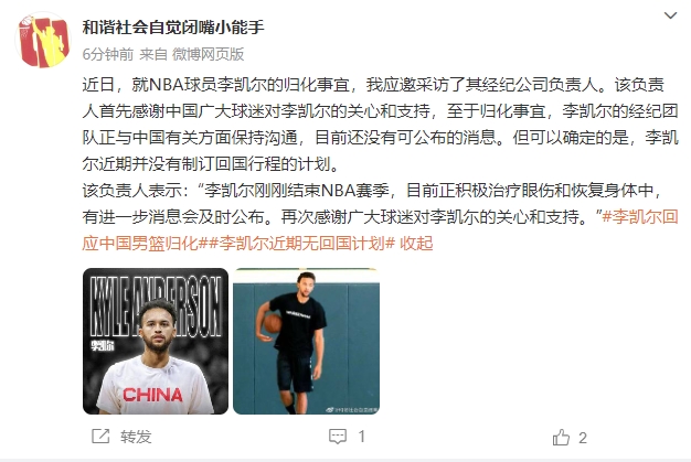 “Recently, I was invited to interview the head of his brokerage company regarding the domestication of NBA player Li Kael. The person in charge first thanked the Chinese fans for their concern and support for Li Kele. As for the domestication, Li Kele’s brokerage team is maintaining communication with relevant Chinese parties, and there is no news to be announced. But what is certain is that Li Kael has not made a plan for returning home recently.”