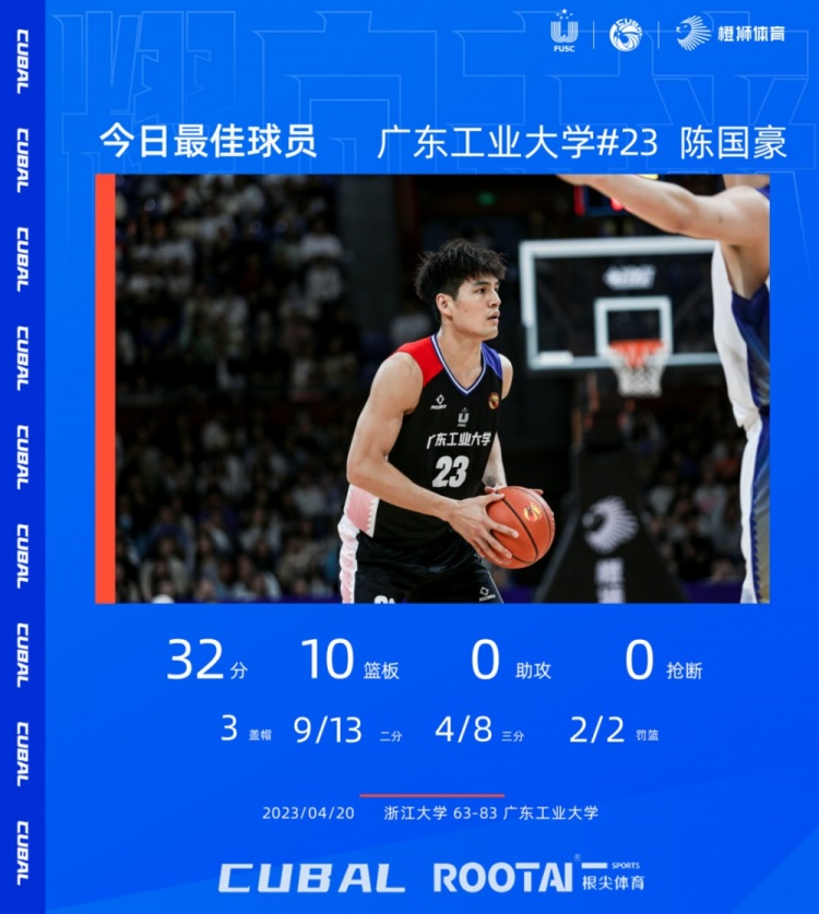 Today’s best player belongs to Chen Guohao, No. 23, Guangdong University of Technology. He scored 32 points, 10 rebounds and 3 cap in the game against Zhejiang University. He led the team to beat his opponent when he fell behind in the first half, and advance to the southeast finals!