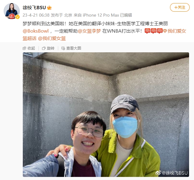 Live broadcast bar, April 22 News before China’s women’s basketball translator Xu Xufei updated her personal microblog yesterday, drying out Li Meng, the women’s basketball national hand who has arrived in the United States, and taking a photo with her personal new translator.