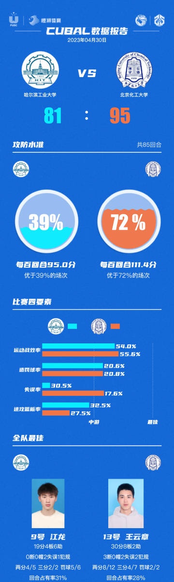 In the last quarter, Beihua adjusted its state. Wang Yunzhang directly ignited the atmosphere of the whole game with one hand. Then Beihua won the game all the way after winning the Victory. Finally, the score of the whole game was 81-95, and Beijing Chemical industry won.