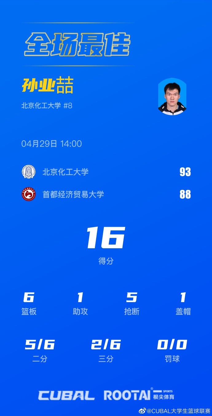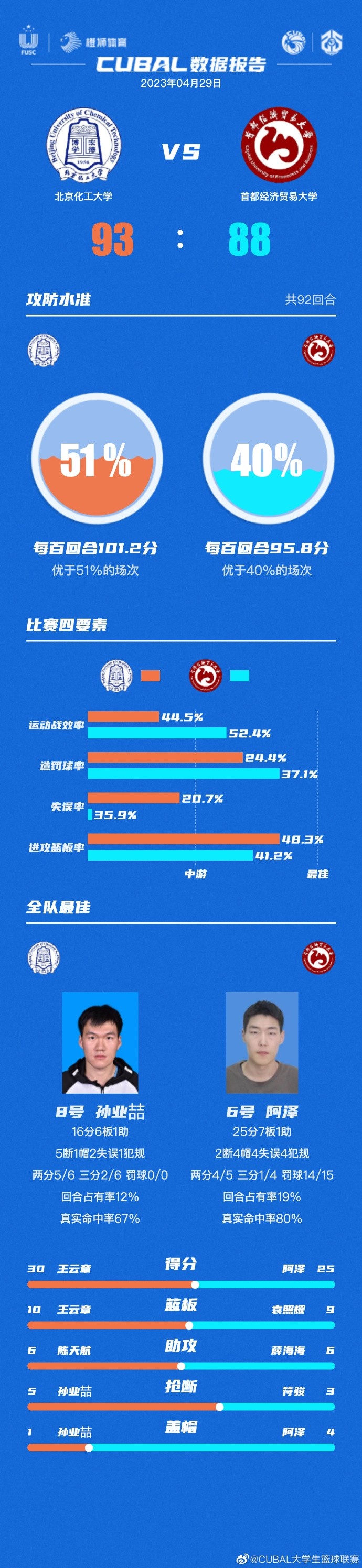In the third session, the fire power of North chemical industry was fully opened, and both sides felt completely opened. The frequent three points into the network led the score of North chemical industry all the way. The third quarter ended with a score of 76:62. At the end of the quarter, beichemical industry was even more advanced. Wang Yunzhang three points, Sun Yizhong Zhang hengshuo, the midfield put pressure on him to steal, and the sudden speed of the rhythm made the first economy and trade exhausted, moreover, Yuan’s five criminals left the market, which also slowed down the offensive tempo of Beihua. However, at the critical moment, Fu Jun’s three points were cut off and the score was reduced again. However, it was difficult to catch points at the last three points. Finally, the game ended with a score of 93:88, and Beijing Chemical won.
