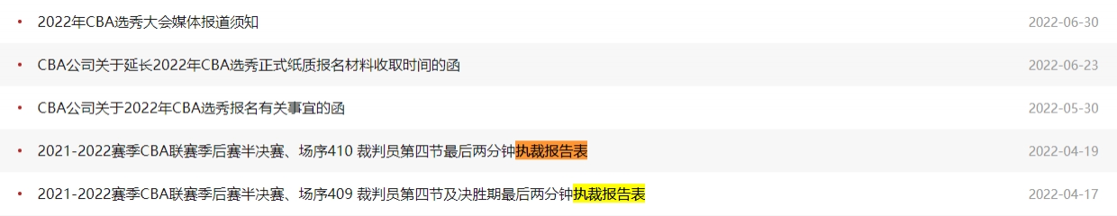 The last referee report (the last two minutes of the ruling report) in the announcement on the official website of CBA is still April 19 last year.