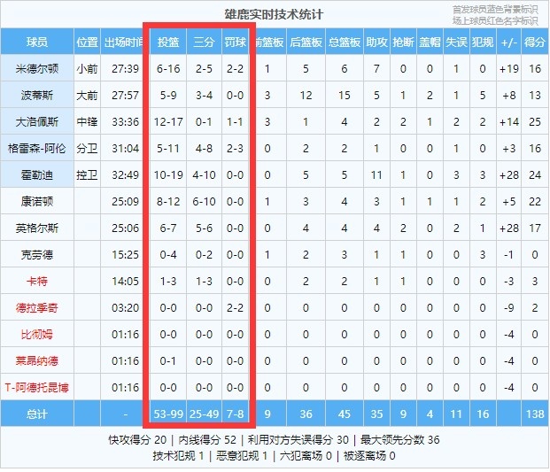 In this game, the Stag shot a very high hit rate, with a hit rate of 53.5 percent among the 99 shots and 53 percent of the 99 shots. Among them, the hit rate was as high as 51 percent among the 49 shots and 25 shots of the 3-pointer.