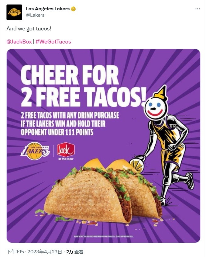 The Lakers officially held an event. As long as the Lakers win and limit their opponent’s score to 111 points, fans can get two free tacos after buying any drinks.