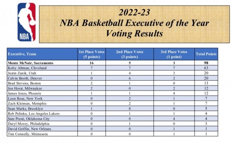 Live Bar, May 4-today, NBA announced the best executives and votes this season. King general manager McNair was elected the best general manager.