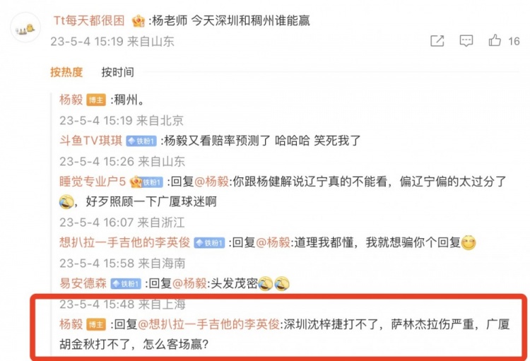 When other fans began to ask about the reason, Yang Yi replied, “Shenzhen Shen Zijie can’t play, Salinger is seriously injured, how to win away?”