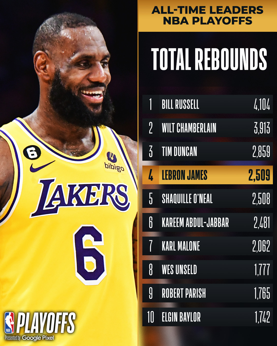 In this game, James scored 30 points, 9 rebounds, 9 assists, 2 steals 1 block, and the total number of individual playoff career rebounds came to 2511, surpassing O’Neal (2508) to the fourth in history.
