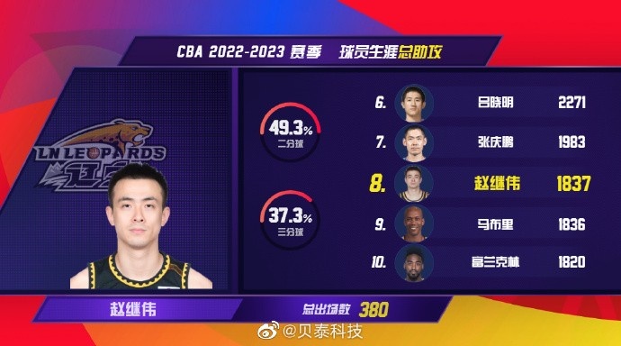 So far, the total number of assists in Zhao Jiwei’s career has come to 1837 times, surpassing Marbury (1836 times), ranking the eighth in the CBA history assist list.