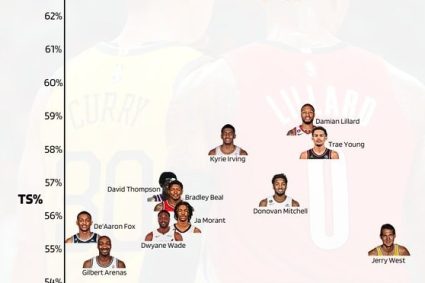 Live broadcast bar, June 19 today, data from media Automatic drew a chart of real hit rate and career average score. The restriction on players is that their height is less than 1 meter 96, and the career field has scored 20 points. As can be seen from the chart, Curry’s career Real hit rate (62.7%) was cut off and led. Lillard was closest to it, but it was already a distance away.
