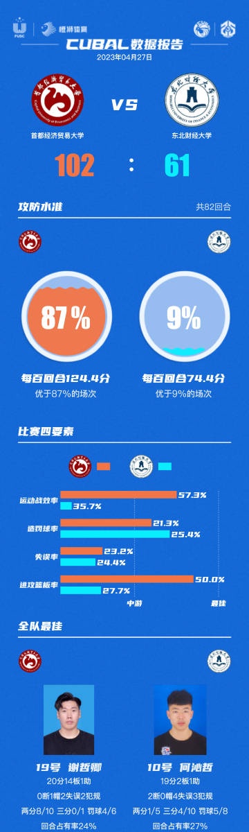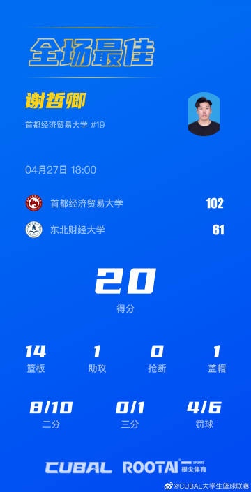 In the end, the two sides entered the fierce offensive and defensive conversion as soon as they came up. The quality of offensive and defensive Dongbei University of Finance and Economics was improved compared with before, but it was still difficult to resist the offensive of the first economic and trade. Finally, the whole game ended with 102-61 and won capital ecnomic and trade.