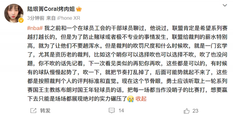 After the game, “barbecue sister” Lu Yinzhen talked about the referee on weibo. She said: “I talked with a cadre player in the players’ union before, and he said, the league certainly hopes that the longer the series of matches will be played, but in order to prevent gambling or extremely unprofessional things from happening, the league pays the referee a particularly high salary, just to let them not get involved in the muddy water. However, the punishment scale of the referee and when to blow is a metaphysics, especially for the judges with old qualifications. For example, you can choose to blow or not to blow this whistle, it’s OK to blow it. If you don’t blow it, remember it first. The next time you see a similar one, you will blow it again. These are all OK. Sometimes some teams slowly rise up and blow it, the rhythm is disturbed, and the future may not be able to rise. These are all based on the judging criteria and intuition of the referee. At this moment, Warriors should listen to what King Coach Brown said to King’s young players in the last round of series and regard every match as a match without whistle, if you want to win, you can only show absolute strength in the field.”