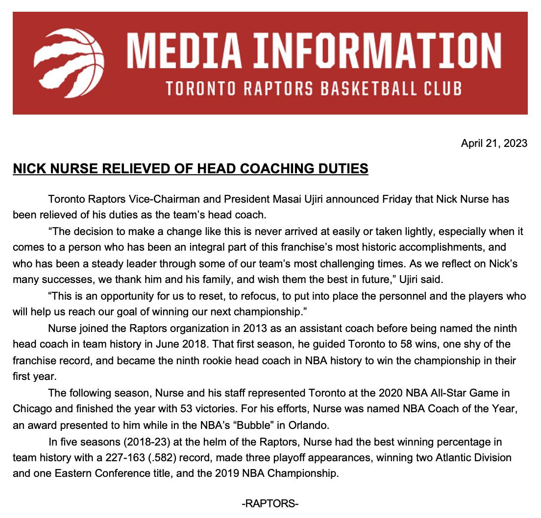 The Raptors then officially announced the dismissal of NAS.