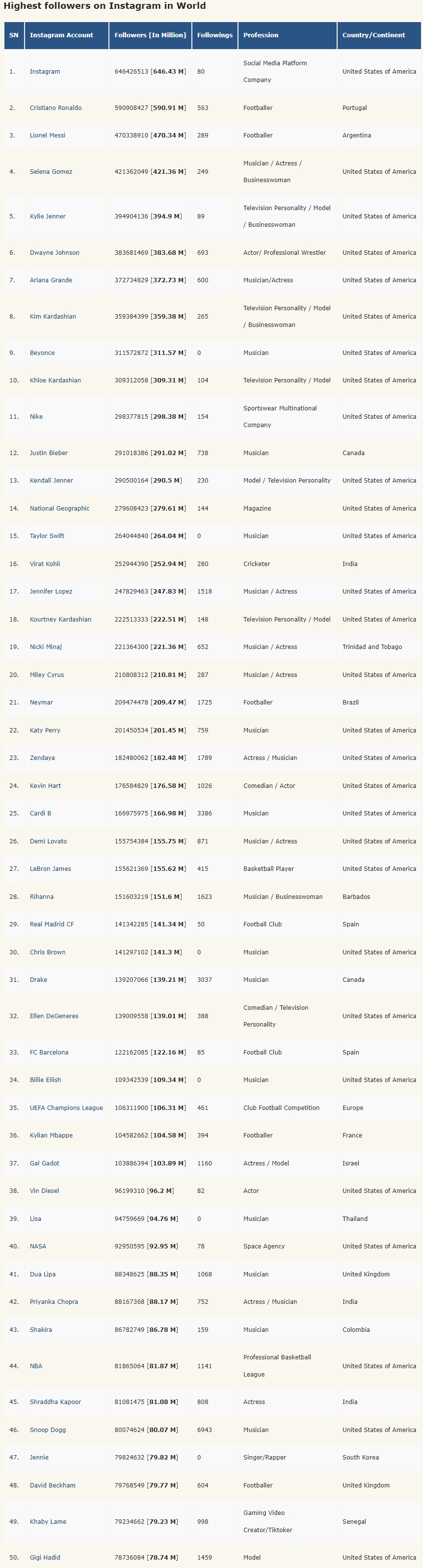 The following is the list of Instagram fans ranked by foreign media in 18th day of this month–