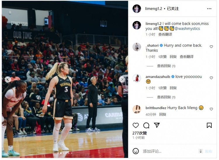 Live Bar, June 19-today, Li Meng, women’s basketball Chinese player, updated his personal media. Li Meng posted photos inside and outside the stadium and wrote, “I will return soon. I miss you all!@ Washington mystery man” In a WNBA regular season that ended today, the Washington mystery man defeated Chicago Sky 77-69. Li Meng6 shot 2 (3 points 5 Middle 2), scored 6 points 2 rebounds 2 assists 1 steals, positive and negative value is +7. According to previous reports, Li Meng will leave the team this week and represent China women’s basketball in the women’s basketball Asian Cup. She is expected to return to the team around July 3.