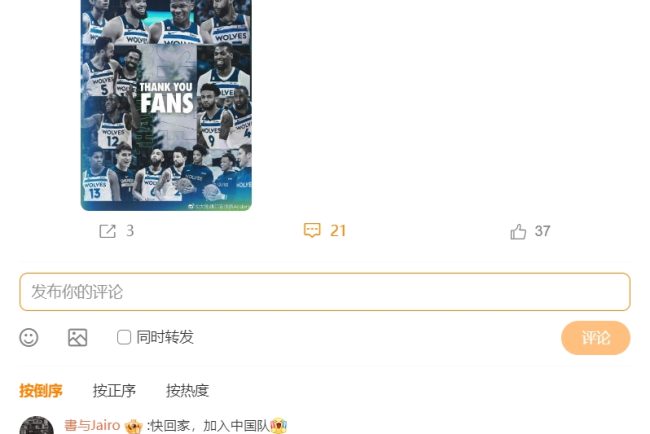 Live broadcast, April 26 news Forest Wolf lost to Nuggets today 1-4, and this season’s journey is all over. On sledge-hammer, Carl Anderson posted a microblog today to thank the Timberwolves fans. Li Kael wrote, “Thank you all for your support this season, the Timberwolves fans.” Chinese fans in the comment area shouted, “go home and join the Chinese team.” **************************************************************************************************** Men’s basketball