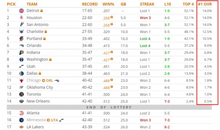 Live broadcast, April 22-today, the 2023th top champion banyama announced that he would participate in the 2023th NBA draft conference. At present, the probability that each lotto area gets the first prize in sequence is as follows: 1. Piston 14.0% 2. Rocket 14.0% 3. Spurs 14.0% 4. Wasp 12.5% 5. Pioneer 10.5% 6. Magic 9.0% 7. Walkers 6.8% 8. Wizards 6.7% 9. Jazz 4.5% 10. Lone Ranger 3.0% 11. Magic 1.8% 12. Thunder 1.7% 13. Raptors 1.0% 14. Pelican 0.5%