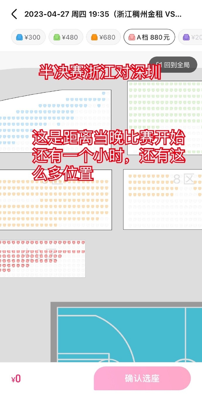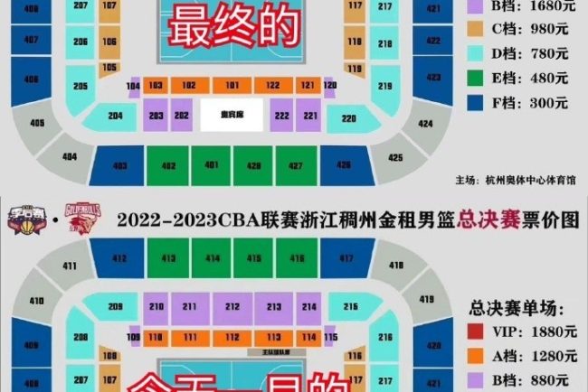 Live Bar, May 6th news the first game of CBA finals this season will be held at 19:35 p.m. on May 8th at the home of Zhejiang team. The home ticket price of Zhejiang announced earlier today: the lowest ticket price is 280 yuan, the file is 1280 yuan, and the highest VIP is 1880 yuan. But tonight, the ticket sales platform shows that all ticket prices have risen, among which: Gear A rose from 1280 yuan to 2080 yuan; B level rose from 880 yuan to 168 yuan; Level C rose from 680 yuan to 980 yuan; D File rose from 580 yuan to 780 yuan; E file rose from 380 yuan to 480 yuan; F file rose from 280 yuan to 300 yuan. It is worth mentioning that the media person @ basketball hoop junior high school students showed the ticket sales of Zhejiang home court against Shenzhen in the semi-final. You can see that there are still many vacancies in the stadium one hour before the opening.